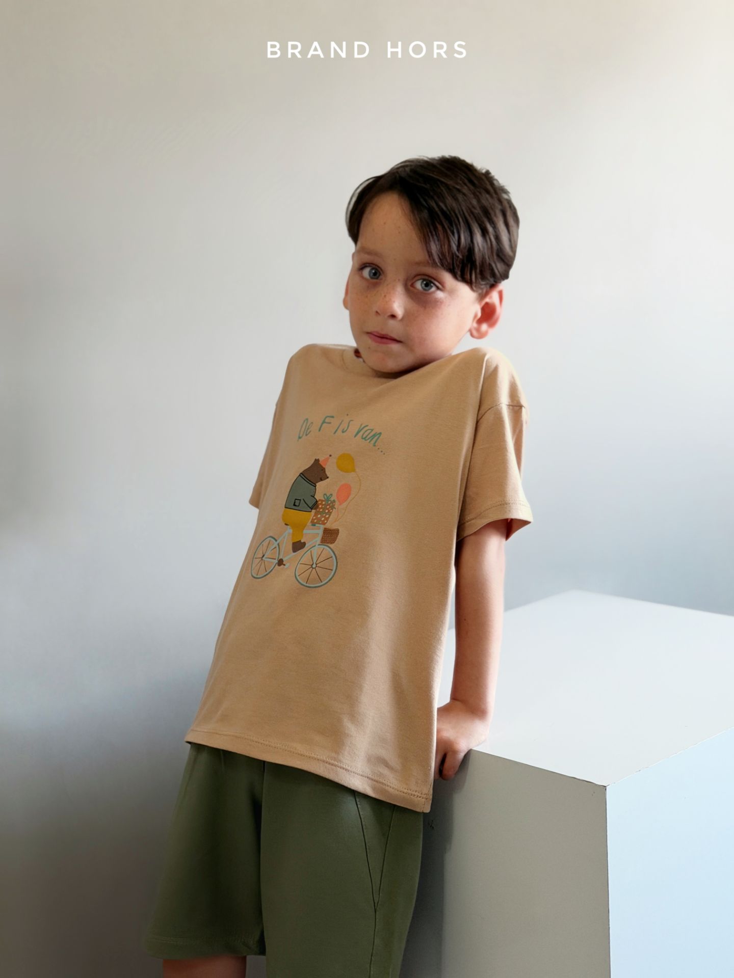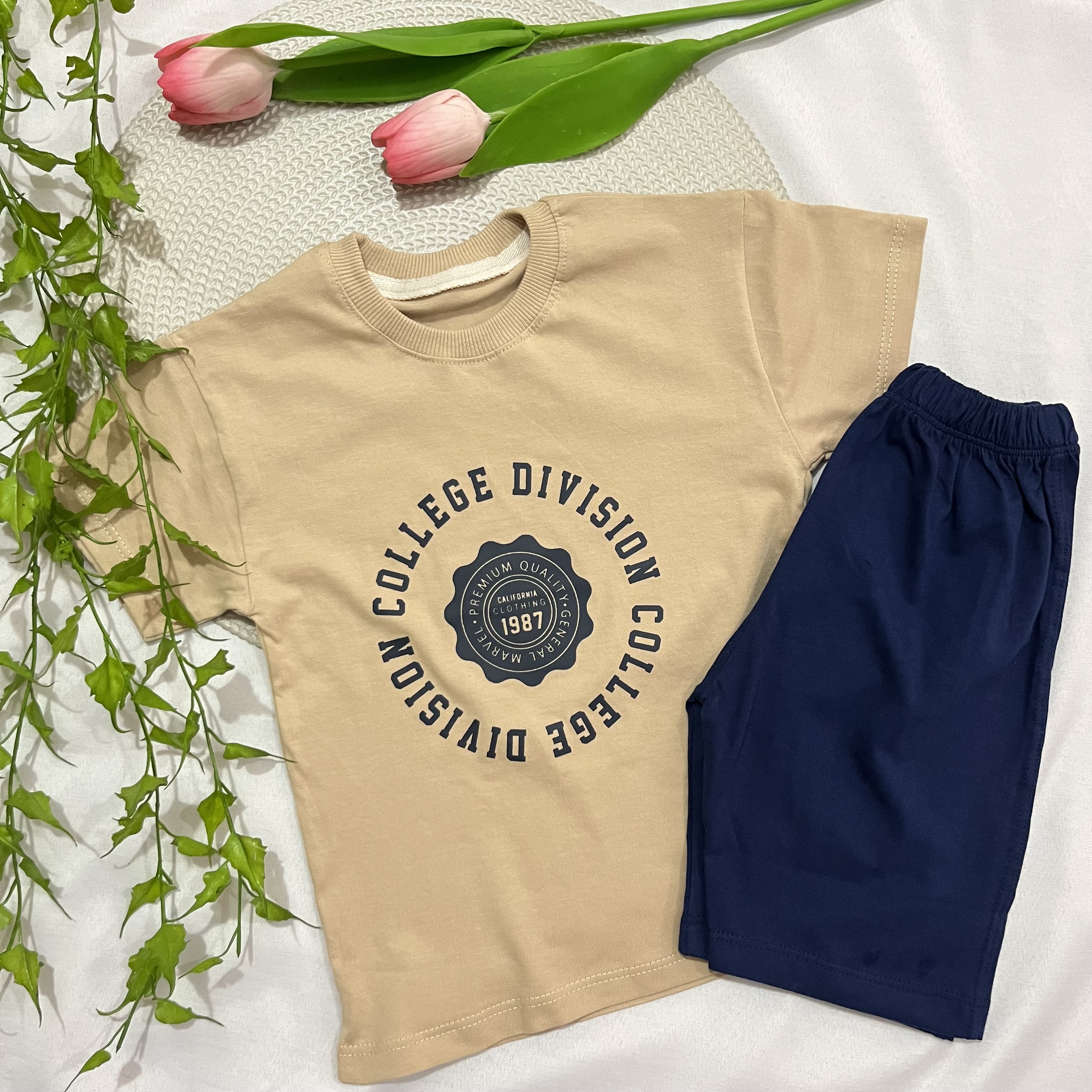 ست بیسکویتی تیشرت و شلوارک بچگانه رنگ کرم و شکلاتی و طوسی | سایز ۳ تا ۱۱ سال