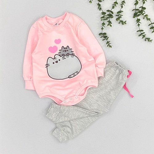 ست بادی شلوار دخترانه طرح گربه جنس دورس دو نخ فول پنبه | سایز 6 تا 36 ماه