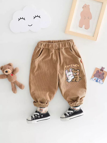شلوار بچگانه کمرکشی تک مخمل کبریتی وارداتی طرح خرس و خرگوش رنگ قهوه ای روشن | سایز ۱ تا ۵ سال