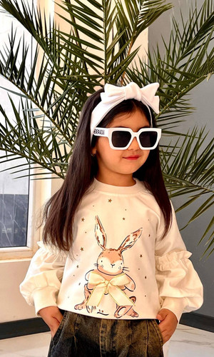 بلوز دورس دخترانه طرخ خرگوش آستین چین دار رنگ شیری | سایز ۳ تا 10 سال