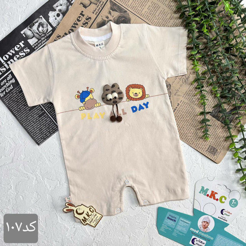 رامپر پسرانه کرم رنگ جنس یکرو پنبه طرح گربه برجسته ۳ ماه تا ۲ سال
