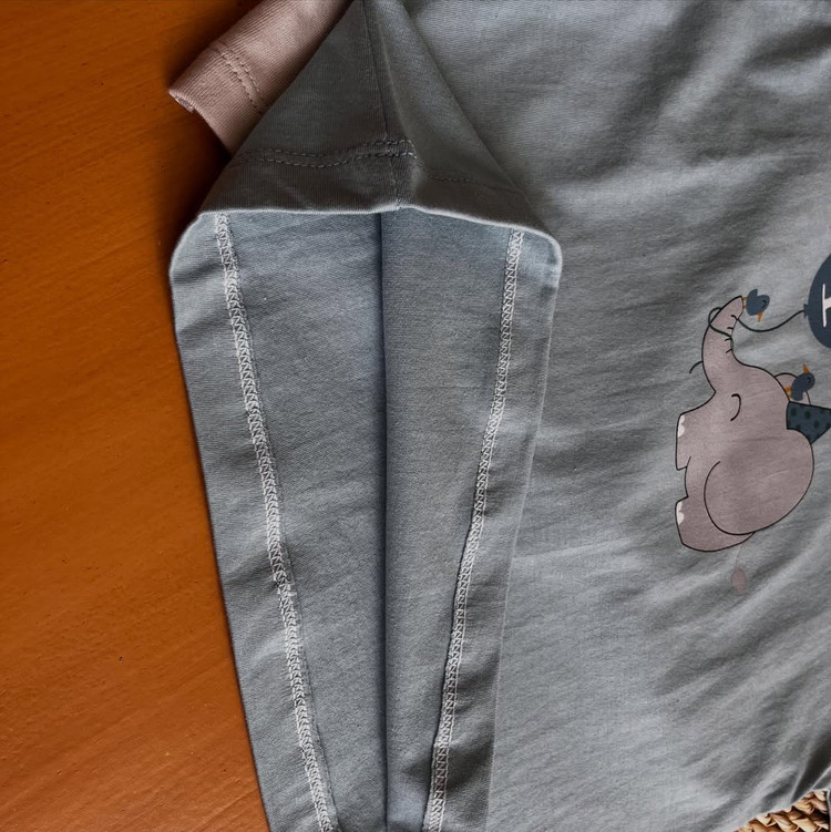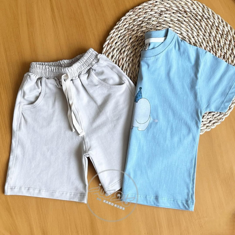• شامل: تیشرت آبی با چاپ فیل + شلوارک کرم